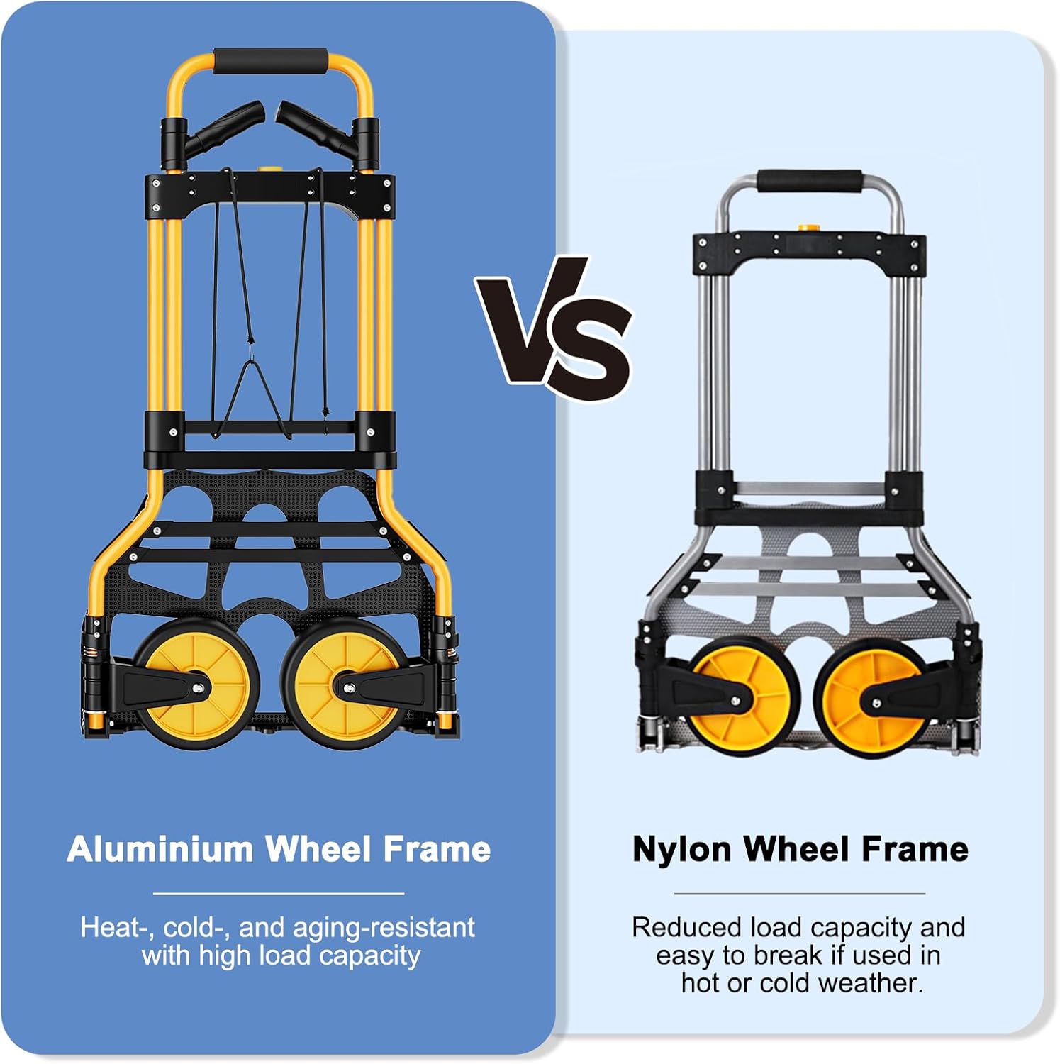 - 💎【Upgraded Aluminum Wheel Frame & Extended Steel Pipe Tie Rod】Unlike plastic wheel frames, aluminium wheel frames offer superior load carrying capacity and reliability,Especially in cold or hot weather conditions(Plastic wheel frames break easily in cold or hot weather),Our aluminum Wheel Frame hand truck is your reliable working partner. When fully extended, the trolley reaches a height of 45.67 inches, providing comfortable use for most people while maintaining its strength and stability